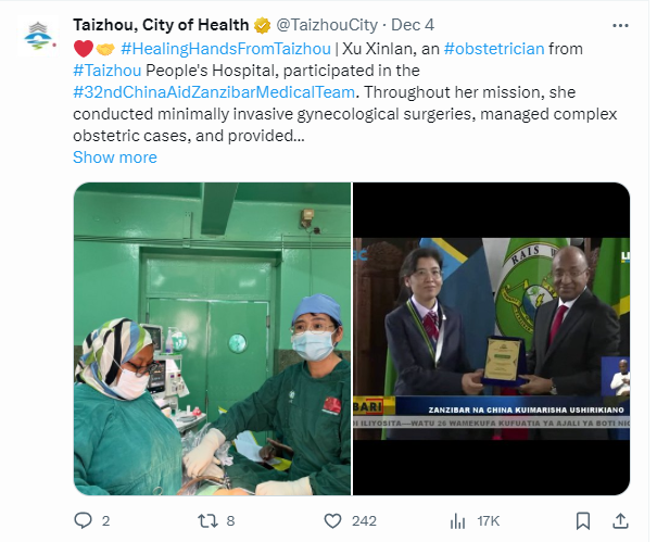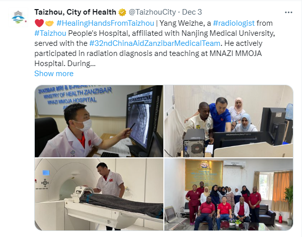 根据江苏省援外医疗队组派工作计划,泰州市独立承担了中国(江苏)第32期援桑给巴尔医疗队组派任务,20位队员来自泰州市的5家医院和1家学校。2022年9月至2023年9月一年间,他们完成了近7万例次病人的诊治,完成手术6508例次。开展新技术、新疗法89项。他们还为当地医院、学校、孤儿进行了15次捐赠,谱写了一曲跨越山海的友谊之歌。