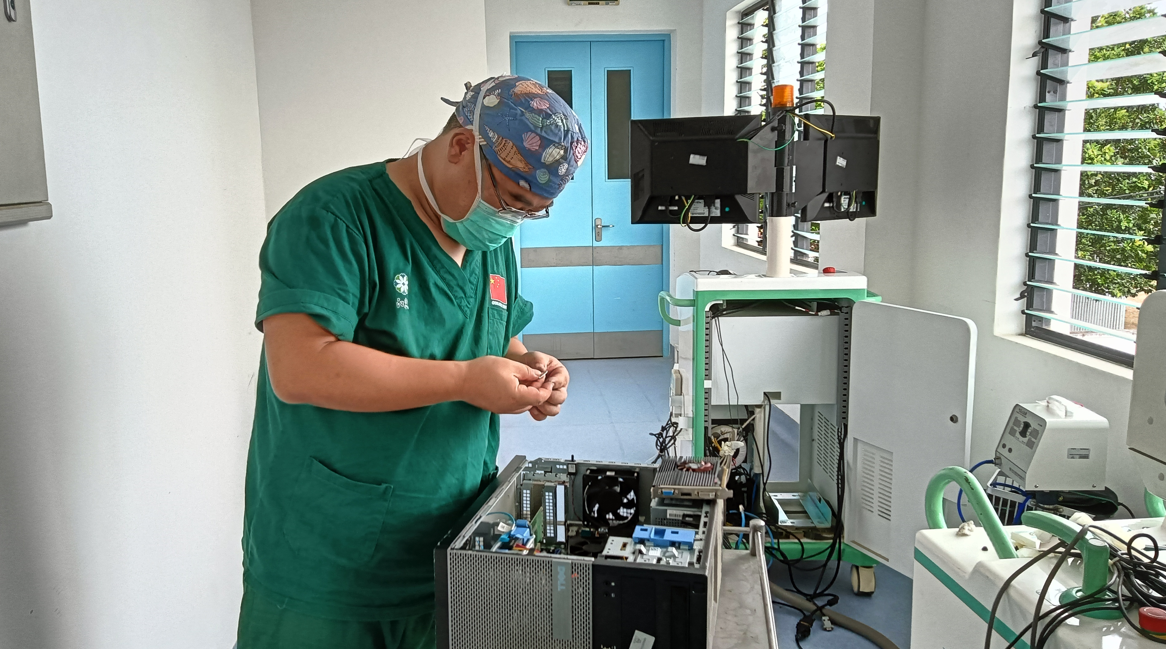 On Tuesday, March 20, 2023, facing the rising sun, Dr. Yang Guojin the orthopedic surgeon of the China Medical Team came to the operating room to prepare for the day's work. Local staffs told him the patient was being prepared for anaesthesia. Because it was an operation requires to use C-arm X-ray machine on that day. Dr. Yang Guojin normally opened the C-arm machine, but the machine did not work. After checking the machine, he thought that the main control computer of the C-arm machine may have a hardware failure, just for the electrical equipment maintenance has some experience, so he tried to repaire it himself. After suspending the operation, he found some tools such as screwdriver, multimeter, and quickly eliminate the fault after efforts. Then the machine worked normally. Dr. Yang Guojin was praised by local staffs nearby with the words "good engineer".
