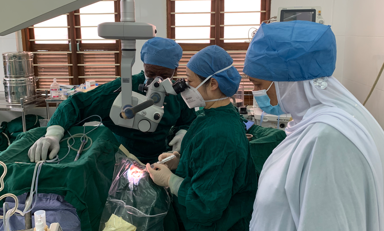 我在这里主要从事眼科一线临床与教学工作,同时也会利用周末时间随队伍参加偏远地区的义诊工作。每周一三五是门诊日,周二周四是手术日。桑给巴尔地处赤道地区,紫外线强烈,白内障患者众多。由于地域和人种的原因,也有不少青光眼患者。这两种疾病是造成当地人民失明的主要原因。每个门诊日,我都会看诊40-60例患者,都是急切需要复明手术的或者是一些当地医生无法解决的疑难病例。每个手术日则需进行10台左右的手术,其中,90%是白内障超声乳化术。尽管如此,还是不能满足当地民众的就诊需求。因此,与科主任协商后,增加一个手术日,这样,每周我就有三个手术日,可以为更多的患者进行手术。在过去的近一年的时间里,我总共开展了近千例手术。