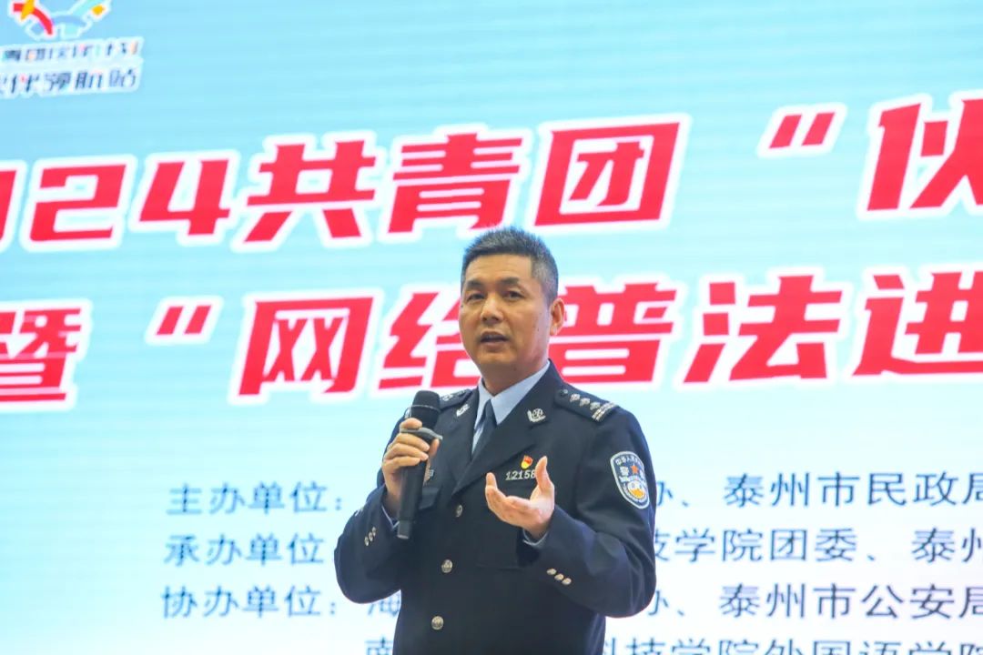 在第十一个国家宪法日来临之际,为提升在校大学生法律知识应用能力与网络安全防范意识,12 月 2 日,由泰州市委网信办、泰州市民政局、泰州团市委、泰州市青联主办,南理工泰州科技学院团委、泰州市大城小爱公益服务中心承办,海陵区委网信办、泰州市公安局海陵分局、海陵团区委、南理工泰州科技学院外国语学院协办的2024 共青团“伙伴计划”示范项目暨“网络普法进校园”主题活动圆满举行。吸引了市区青年社会组织代表、青联委员代表、南理工泰州科技学院师生代表共 500 余人积极参与,在校园内掀起了一股网络普法与反诈的热潮。
