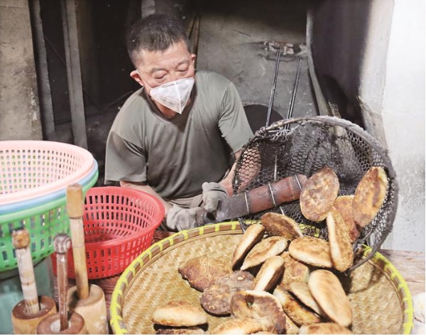 郭金才从炉内取出烧饼倒入匾内。 钱宏斌 摄