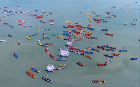 湖岸边,中外游客一边看会船,一边用手机记录下震撼场景,还不时打探溱潼会船的由来。相传南宋抗金名将岳飞,曾任通泰镇抚史兼泰州知州,多次大败金兵于溱湖,溱潼百姓每年清明节都组织篙子船祭扫阵亡将士,这样的习俗代代相传,经久不衰。千年传承,一代代水乡儿女在不同年代,把会船文化与时代上新元素相融,演绎“船”奇精彩。