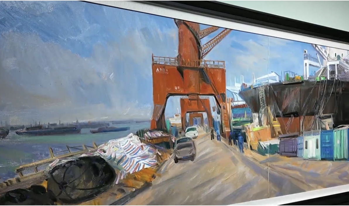 走进展览,中国美术家协会主席范迪安创作的4米巨幅油画《面向世界——新扬子造船之景》率先映入眼帘,磅礴的工业美学形成新的江岸风光,叙写泰州“大海新晨”壮丽篇章。