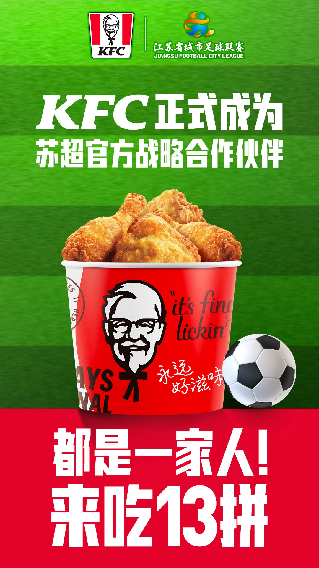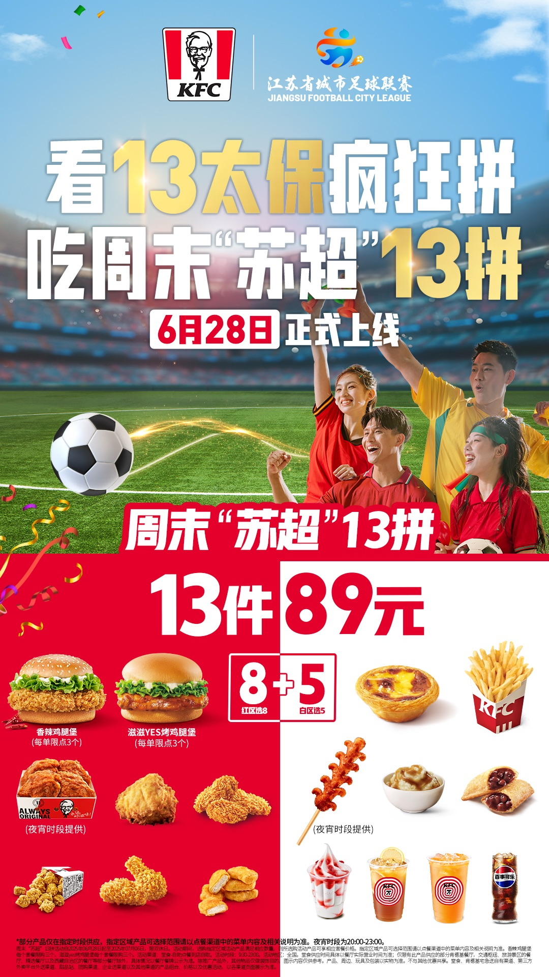 加入“苏超”大家庭后,肯德基将积极支持“苏超”宣传推广工作,策划一系列有趣、有梗、有料的活动,将苏超文化、球迷热情和消费体验紧密串联起来。据了解,肯德基将于6月28日起,全渠道周末特别推出“周末苏超13拼”活动。届时,4300多家肯德基线下门店的点餐屏也将化身电视屏幕,实时直播比赛盛况。