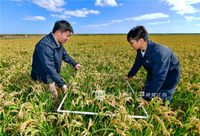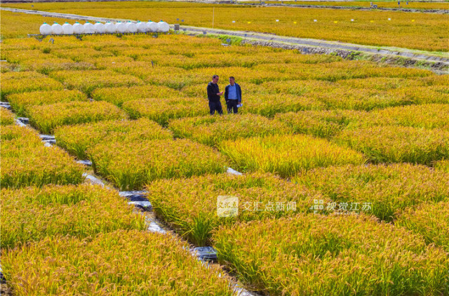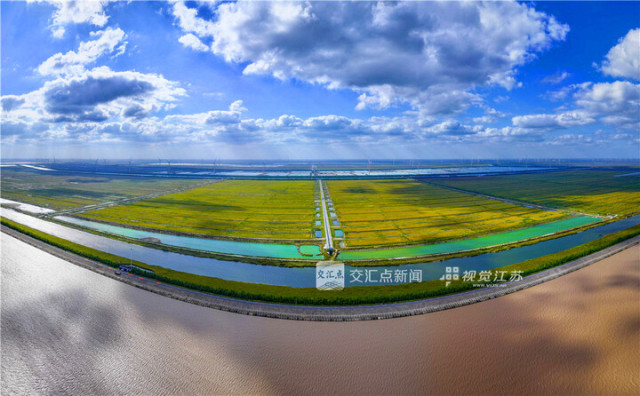 10月23日,俯瞰黄海边的6858亩国家级高标准农田一片金黄,今年,该地亩产创下江苏沿海盐碱耕地种植新高。