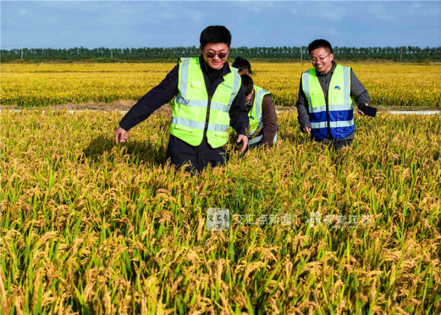 10月24日,研究人员贾君德(左)在试验田实地查验稻米生长情况。