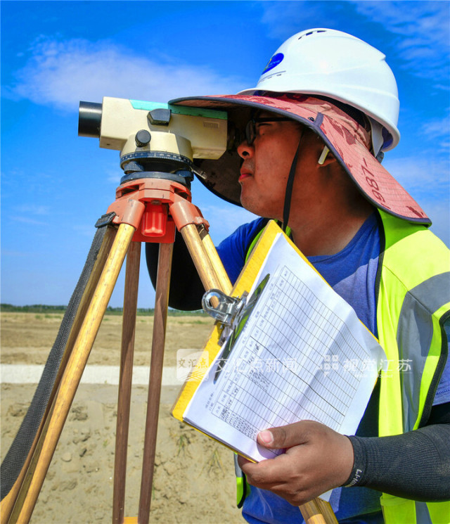 6月5日,工作人员袁钰斌使用水准仪测量土地高差,校核平整参数。