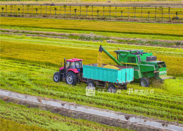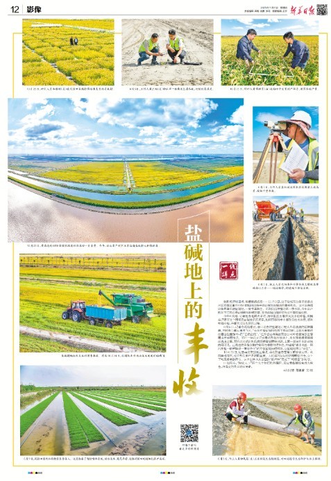 盐碱耕地经改良后的首季丰收,图为10月24日,收割机恣意驰骋在沉甸甸的稻穗间。