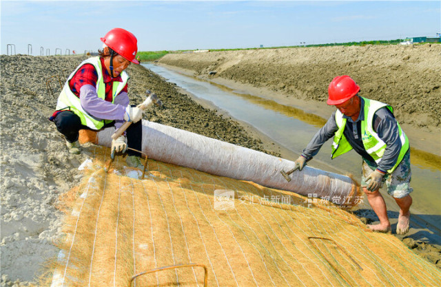 6月3日,作业人员柳凤英(左)正在铺设生态植被毯,对田地进行生态防护与水土保持。