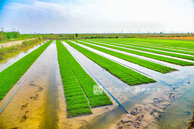 6月5日,记者在现场看到,昔日泛白的盐碱地已被大片绿油油的稻秧覆盖,不时有白鹭从田间飞过。“去年初夏盐碱地改良工程启动时,半数农田里还泛着含盐量超4‰的‘白色盐斑’。”江苏省沿海集团东台公司种植管理部主管周龙祥感慨地说。而在一块尚未完成最终改造的地块上,淡水随着灌渠缓缓渗透进土壤,而经过过滤的水流最终顺着涵管排出时,上面一层被析出的盐碱肉眼可见。正是这样纵横交错的管网与灌排沟渠相连,构建起“灌水洗盐—明沟排盐—暗管降渍—循环净化”的立体盐碱治理网络,让盐碱地得以“新生”。