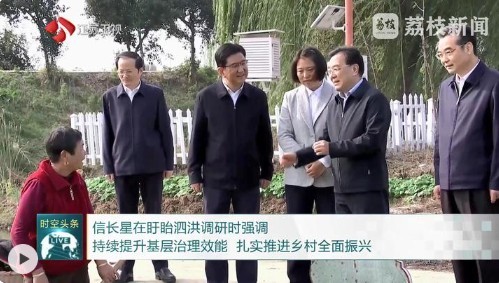 11月13日,省委书记信长星到淮安市盱眙县、宿迁市泗洪县调研。他强调,要深入学习贯彻党的二十届四中全会精神和习近平总书记对江苏工作重要讲话精神,持续提升党建引领基层治理效能,扎实推进乡村全面振兴,让现代化建设成果更多更公平惠及广大群众。