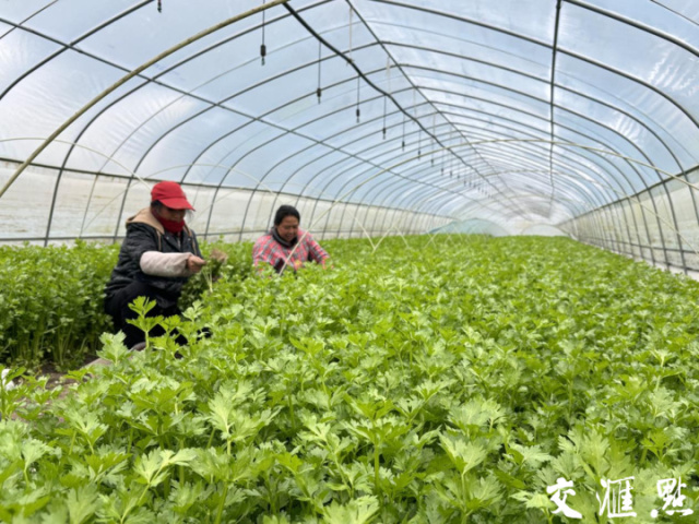 芹菜大棚里,几名工人正在采收,空气里弥漫着新鲜芹菜浓郁的香气。熟练摘菜、橡皮筋捆扎、麻利装筐,61岁的许龙英蹲在地上,鲜嫩的芹菜苗在她双手间翻飞。“我家就住这个村,家门口一小时挣七八块钱,满意了。”和她一样的本地工人,基地内有30多个。