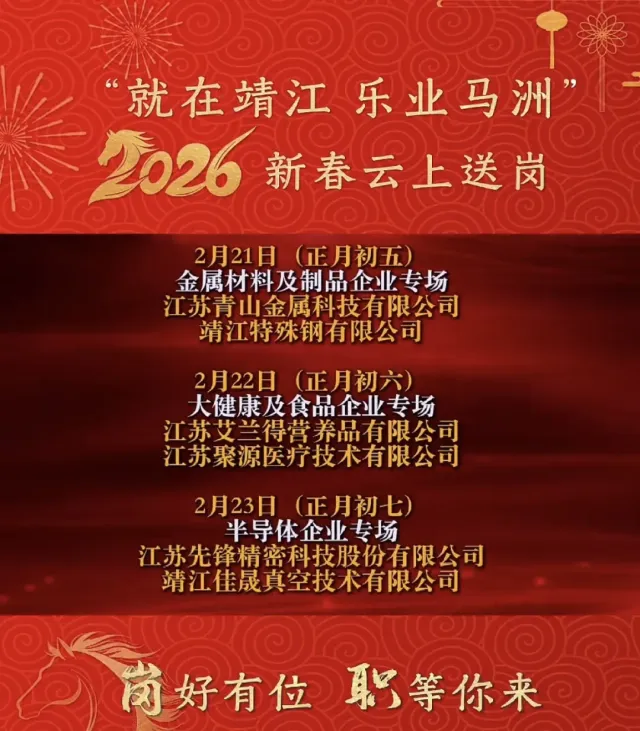 正月初九,我市还将在长江文化中心举办“就在靖江 乐业马洲”2026年新春大型招聘会暨“万马奔腾”人才集市活动,全市166家重大产业、重点企业齐聚一堂,发布超5000个优质岗位,这不仅是求职者的盛会,更是城市与人才的双向奔赴。现场还设置人力资源服务机构联合招聘,“靖暖就业”重点群体帮扶两大特色服务专区,并提供AI智能求职、创业展示、技能展示、职业指导等配套服务,全方位助力求职无忧。